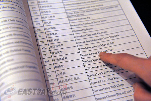 12月22日,“百叶结烧肉”译作“Stewed Pork Cubes and Tofu Skin in Brown Sauce”、“蛋黄狮子头”叫做“Stewed Meat Ball with Egg Yolk”、“干锅鸡”的英文翻译则为“Sauteed Chicken with Pepper in Iron Wok”等等。22日下午,作为上海市徐汇区餐饮服务行业迎世博主题活动重要内容的《徐汇区餐饮服务行业中文菜单英文译法》正式发刊。
