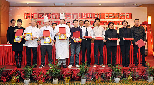 除发布菜单英文译法外,徐汇区迎世博600天行动窗口服务指挥部针对窗口服务中社会接待面广、影响度高的餐饮行业,以“政府搭台、企业推介”为主线,在企业自荐、行业推荐的基础上,结合各餐饮企业的实际情况,评选出了徐汇区首批世博特色菜、特色点心,并向这些菜点的制作单位及市区文明餐厅代表进行了授牌。