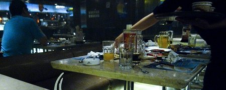 在一家自助餐厅内,顾客离去后留下没吃完的食物饮料。