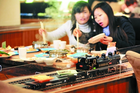 阿里山火车主题餐厅用小火车回转送菜的方式让消费者感觉很新鲜
