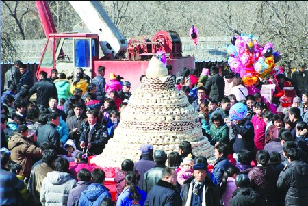 2月18日(大年初五),由梁山县举办的“好客山东贺年会·梁山好汉过大年”系列活动“扈三娘比武招亲”,在梁山风景区举行。这块4600斤的大花糕一亮相,牢牢地“黏”住众人眼球。花糕高2010毫米,从下往上分36层;最底下的一层,直径2.4米,有108个花瓣,寓意108条好汉;倒数第二层72个花瓣。花糕侧面写着“好客山东、梁山贺年”、“风调雨顺、五谷丰登”等字样。