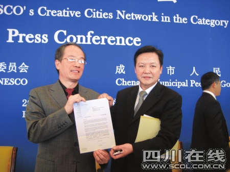 辛格在新闻发布会上宣读了联合国教科文组织总干事伊琳娜·博科娃致成都市人民政府市长葛红林的确认信。