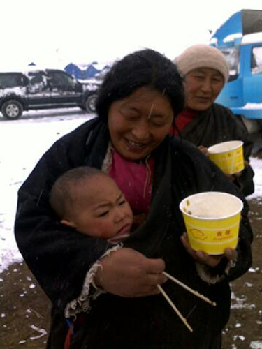 今晨下起了大雪,但是队员们的热情没有受到任何的影响,早上八点钟我们准时将热乎乎的饭菜送到排队群众的手中。现在,雪越下越大,帐篷前昨天的洋灰马路今天变成了“水泥”马路,灾民们陆续进来用餐,他们吃着热腾腾的饭菜,还不时的相互让对方尝自己饭菜的口味,他们用藏语边吃边聊,走的时候还会给自己的家人带回一两份给家里的病人。到目前为止,已经有200多人来进餐了,看到我们的辛勤劳动得到认可,真让人欣慰!