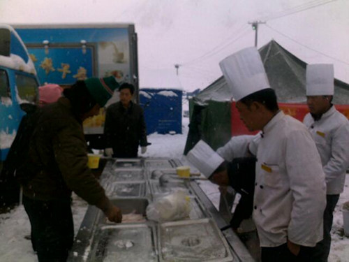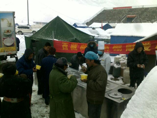大雪中西藏餐饮赈灾团为灾区同胞送上热腾腾的饭菜