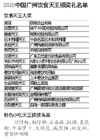 第二届“广州饮食天王评选”是在广东省经济和信息化委员会的支持指导下,由广东省餐饮服务行业协会、香港饮食天王推广机构、广州地区餐饮行业协会、广州地区烹饪协会、广州西餐行业协会等联合主办。主办方介绍,今年的颁奖典礼,最有广州特色的是新增的月饼天王、手信天王,分别由广州知名老字号广州酒家、莲香楼摘取。