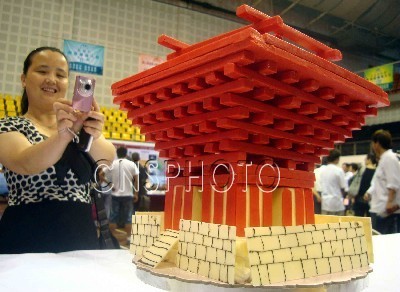 9月20日,一名参观者在美食节上现场拍摄“世博中国馆”形状的巧克力蛋糕。