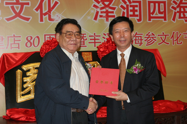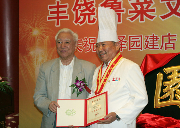 中国烹饪协会会长苏秋成为全聚德集团姜俊贤董事长颁发丰泽园饭店“中华金厨奖”团体奖