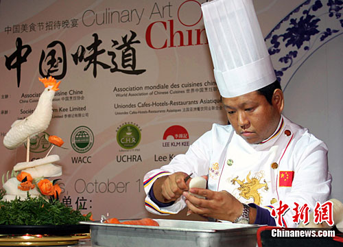 来自中国的一批烹饪大师13日晚在巴黎举行的“中国美食节”欢迎晚宴上,向法国各界及华侨华人表演中国不同菜系美食的制作技艺。这次“中国美食节”由世界中国烹饪联合会和中国烹饪协会主办,重头戏是将在联合国教科文组织总部举行的“中国美食周”活动。