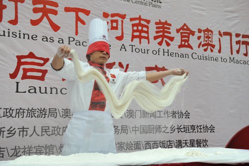 在当天举行的出发启动仪式上,即将奔赴澳门的名厨代表团的团员,现场表演了“用钢刀在气球上切肉丝”、“踩高跷拉烩面”、“蒙着眼睛拉龙须面”等绝技。