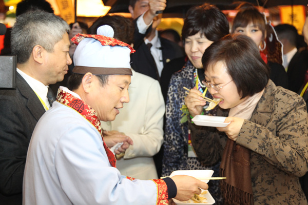 据了解,不仅河南菜受欢迎,曾在上海世博会上亮相的中华(阿五)厨艺绝技表演团也备受瞩目,“脚踩钢刀气球上切肉丝”、“背上切肉丝”、“吹面气球上切青菜”、“高跷烩面”、“拉龙须面”、“果蔬演奏”等绝技让澳门游客看得眼花缭乱。另外,少林武术、杂技、木板年画、糖艺、烙画、泥人等民俗展演,也让人大开眼界。据悉,在第十届澳门美食节上,河南豫菜企业和马来西亚主办方一同荣获了优秀组织奖。