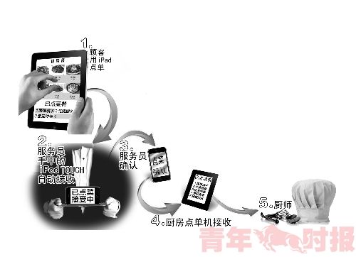 点好菜后,张颖手中的iPod TOUCH马上就接收到了信息。“我只要点下屏幕上的确认图标,厨房里的点单机就会自动打印出客人的点菜单,再送交到厨师手上,这样整个点菜过程就完成了。”张颖介绍。