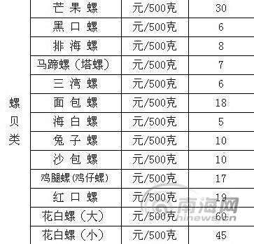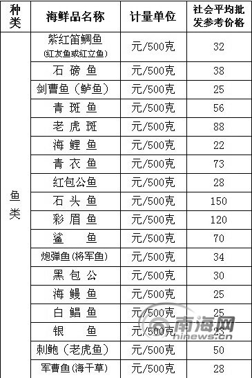 此次公布的海鲜品社会平均批发参考价格一共有四类——鱼类、螺贝类、虾类、蟹类,一共53种,基本上涵盖了大排档里的主要海鲜品种,游客们吃海鲜大多都是点这些。