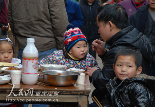 和以往不同的是,今年的“千米长宴”特别开设了亲情宴。江津区委区府的领导和留守儿童、返乡民工、困难群众、百岁老人同坐一桌,一边品尝美味,一边闲话家常,共同祝愿新年团圆美满。