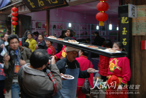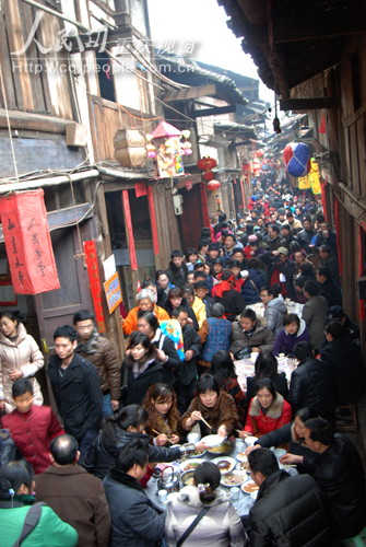 舞狮子、唱山歌、祈福仪式后“开宴了”……16日上午,为庆祝中国一年一度的元宵佳节,江津中山古镇再度摆开“千米长宴”,380桌百家宴延绵在古香古色的街道中,吸引了上万名游客来此地品尝佳肴。