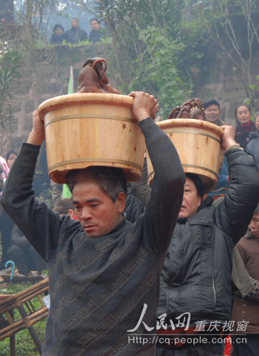 “上菜了!”一个脚穿草鞋,头裹白色头巾的男子应声而来,只见他把一个2米长、10厘米宽的托盘顶在头顶,在拥挤的人群中灵巧的穿梭,沿桌上菜。顿时吸引所有人的眼球。据介绍,这种奇特的上菜方式,在当地叫打盆,将盛满熟菜的木托盆在不用手扶的情况下,搁在送菜者头上,接着由送菜者将头顶上的菜顶着送到各席。