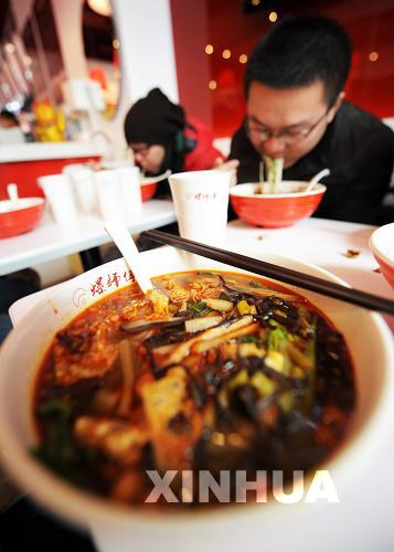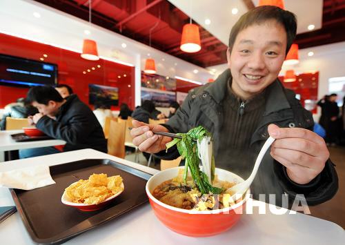 3月1日,顾客在北京市朝阳门外大街的“螺师傅柳州螺蛳粉店”品尝螺蛳粉。