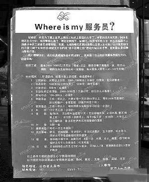 9日,网友“愁思纷繁若斯”发帖称:“看到这份招工启事,姐冲动了!”正文只有3个字:“这福利!”从她贴出的照片上看到,这是一张招聘启事,名字起得很犀利,叫“where is my 服务员?”