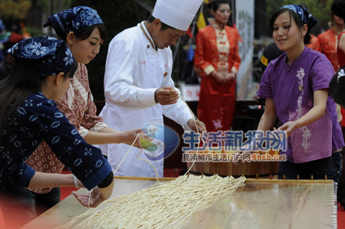 9时30分,扣人心弦的申报中国最长面条——“南诏一根面”大上海基尼斯纪录活动在巍山古城拱辰楼前正式开始。按计划,本次“南诏一根面”冲击的长度为1390米,据介绍,巍山是历史上显赫一时的南诏古国的发祥地,南诏兴起距今正好1390年,因此主办方特意选择这一数字作为南诏一根面的长度。结果做出来“南诏一根面”被认定为1704米,不仅打破了原定计划的长度,而且成为中国最长的手工面条。