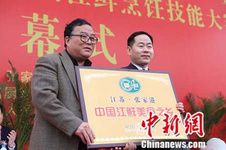 中国烹饪协会副会长路新国为张家港市授予“中国江鲜美食之乡”牌匾。