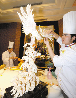 当天比赛现场还展示了7台重庆名宴。重庆市饮食协会会长刘英介绍,今年的名宴,与以往最大区别就是更注重健康养生,所有雕刻、拼盘花型用的材料,全部是食材,都可以食用。而以往,雕刻的材料,大多采用白色泡沫。