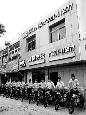 餐馆借网络外卖大赚人气,送餐队伍整装待发。