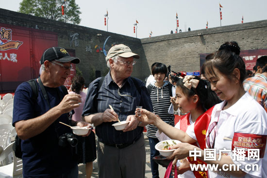 西安4月24日上午,西安城墙南门里举办了一次别开生面的“招待午宴”。来自西安市的100个家庭,拿出自家烹饪的地道陕西美食招待外地游客。2011西安世园会期间,还将有更多的好客陕西人,敞开家门,把外地朋友请进家里,感受西安原汁原味的经典小吃。