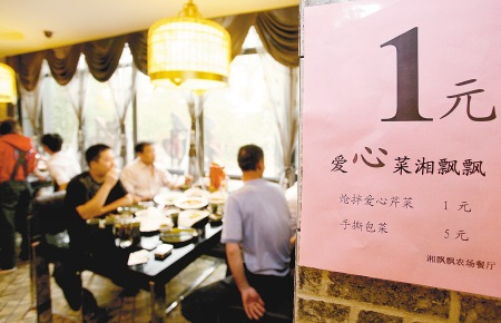 据该店的经理王治宏表示,“这些天,我一直关注媒体关于菜贱伤农的报道,希望能为菜农做点事情,作为餐饮企业,我们决定推出这个“1元爱心菜”,鼓励顾客多吃这些菜,让菜农早日摆脱困境。”
