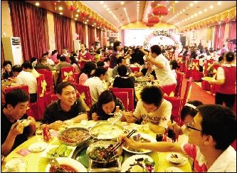 五一小长假期间,江城餐饮市场持续火爆。据武汉市饮食服务管理处统计数据显示,假期3天,餐饮销售3.58亿元,与去年同期相比增长15.5%。今年的婚宴价格每桌大多在千元以上。“五一”期间餐饮消费仍然以婚宴为主,包括太子、湖锦、小蓝鲸、艳阳天、楚灶王等大中型酒店共接待婚宴2.4万桌,平均每天摆8000桌,同比增长10%。