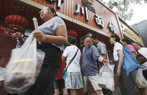 今天上午,在新川面馆新街口店门前,市民排队购面