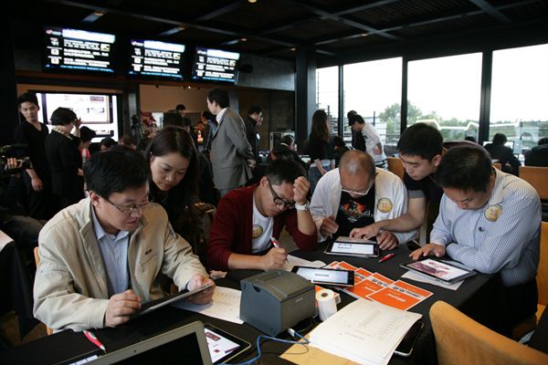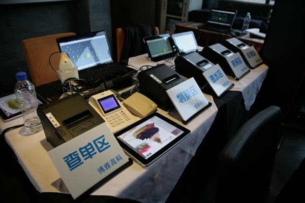 在精心布置的评测台前,评委们分组对10家企业的电子菜谱一一试用,模拟点菜、退菜、下单等操作,并对产品的功能性、稳定性、扩展性、兼容性、创新性、性价比、美观性等项目进行认真打分。