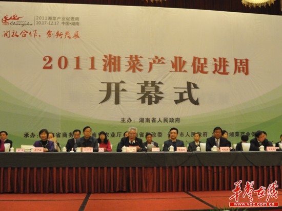 12月1日,以“开放合作,创新发展”为主题的2011湘菜产业促进周活动开幕式在长沙隆重召开。湖南省人大常委会副主任陈叔红宣布2011湘菜产业促进周活动正式开启,省人民政府副省长何报翔发表讲话,省政协原副主席、省湘菜产业促进会会长李贻衡致开幕辞。