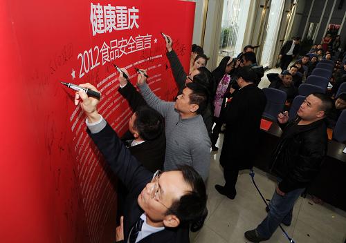 12月29日,重庆市餐饮企业代表在签署《健康重庆食品安全宣言》。当日,重庆市上百家餐饮企业代表共同签署《健康重庆食品安全宣言》,承诺给消费者营造一个放心消费的环境,严格履行社会义务,让老百姓吃得放心,享受健康生活,共建健康重庆。