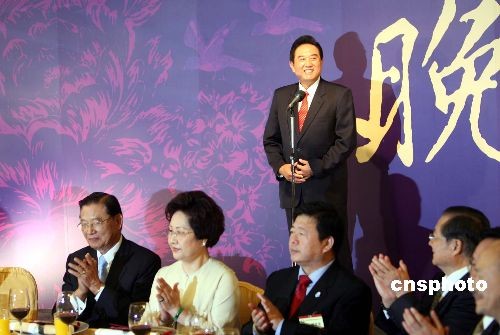 十一月三日晚,台湾海基会董事长江丙坤在世界第一高楼台北101设接风宴,为首次来台的大陆海协会会长陈云林接风。图为陈云林在海基会欢迎宴会上致辞感谢。