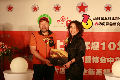 出席此次发布会的有小肥羊公司常务副总裁、首席运营官张占海先生,小肥羊公司高级副总裁、上海大区总经理寇志芳女士等小肥羊的高层领导,有来自内蒙古世博办领导和新闻媒体的朋友。另外国际登山健将、中国登山队队长王勇峰先生以小肥羊代言人的身份出席了本次发布会,并且向上海小肥羊赠送了一份沉甸甸的礼物,接过礼物的寇总说:拿着这份礼物,我仿佛看见了一座攀爬的高峰,小肥羊的全体同仁要一起努力攀登过去,辉煌就在前方。谢谢这份重如千金的礼物。