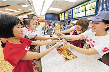 由中国扶贫基金会,肯德基、必胜客所属百胜餐饮集团,联合国世界粮食计划署(WFP)联合《今晚报》、市少年宫在天津推出的“捐一元·献爱心·送营养”活动,昨天开始启动餐厅募捐。无论是大人还是孩子,都可以在百胜集团旗下的任何一家肯德基、必胜客、必胜宅急送餐厅,参加这一公益活动。