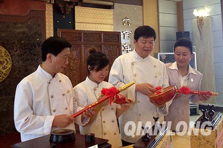 今天是便宜坊集团改制十周年暨创建596周年的喜庆日子。在一台集团员工自已编排的演出中,便宜坊“四大法宝”颁授仪式将庆典气氛推向高潮。其中,中华鲁菜技艺传承大师孙立新执掌的是“炒锅和炒勺”,便宜坊焖炉烤鸭技艺传承人白永明执掌的是“挑鸭杆”,烧麦技艺传承人吴华侠执掌的是制作烧麦的专用工具“走槌”,中华面点技艺传承大师赵海霞执掌的是“擀面杖”。接过沉甸甸的“法宝”,孙立新表示,作为老字号的传承人,他感到的是光荣和责任,他将肩负起将传统技艺传承与发展下去的重任,决不能让传统手工技艺在自己手中失传。
