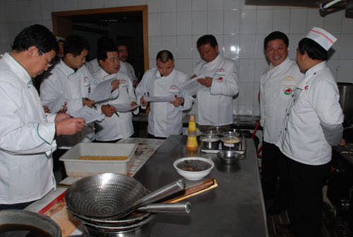 中午11时裁判员们进行了一次模拟打分,他们对金城宾馆的厨师现场操作的两个作品(热菜、面点各一个),从现场操作到品尝进行了逐一细致的评判。