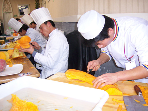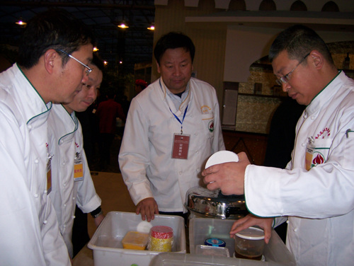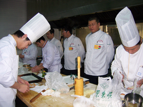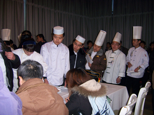 今天第一场比赛7点钟检录,7:30正式开始,选手们不顾严寒和大风,6点多钟就陆续到达比赛检录处等候检录,特别是被分在第一场的石家庄饮食集团的2名选手,他们为了比赛提前一天就来到北京等候比赛,比赛进取精神值得我们学习。选手们排队有序,衣冠整洁,洁白的厨师服和镇定的眼神让人觉得他们对比赛都充满信心。检录现场秩序井然,组织工作安排合理。评委们仔细认真地进行检录,严格遵照检录要求和比赛规则,对所有原料、餐具、器具都进行认真检查,甚至连选手自己携带的水杯也不放过。比赛现场选手们紧张而有序地进行菜品、面点的制作,雕刻选手更是全神贯注。整个比赛现场气氛紧张而热烈。