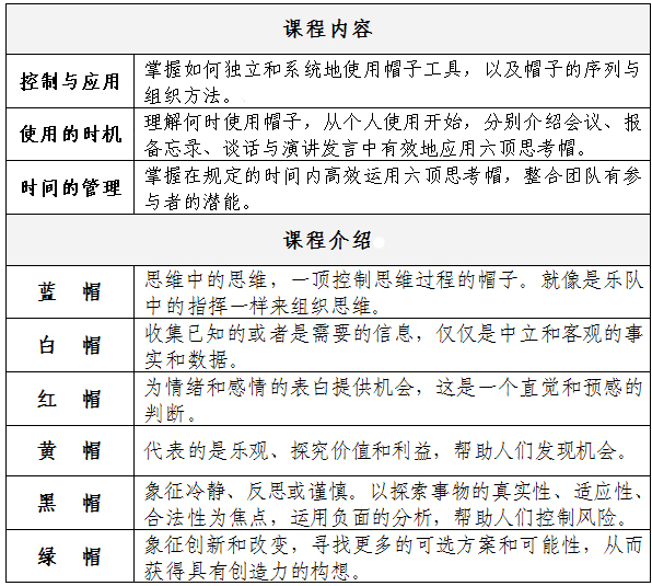 “六顶思考的帽子”是一种简单,有效的平行思考程序,它的主要功能是为人们建立一个思考框架,在这个框架下按照特定的程序进行思考,使我们将思考的不同方面分开进行,帮助人们做事更有效率,更专注, 更加运用智慧的力量。可以极大地提高企业与个人的效能。且一旦学会,立即可以投入应用。