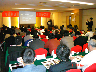 食品冷链物流管理专家、盛福时代(北京)物流有限公司总经理毕鲁湘围绕食品冷链的基本理论、我国冷链物流的应用与存在问题,以及国外冷链物流技术的发展现状进行了详细阐述。北京百万庄园投资集团董事长陈立群介绍了百万庄园企业从创业初期单纯引进冷链运营,发展为企业自身研发开发出具有中国特色的微波隧道“移动配餐车”的成功经验。作为2008北京奥运的供应商,百万庄园担负了光荣而艰巨的使命,与会代表专程参观、考察为奥运服务的新型移动配餐车,品尝经过微波隧道出品温度达到70度以上的奥运套餐。在亦庄开发区学员们实地考察了百胜集团(北京)配销中心,参观了肯德基、必胜客的先进物流系统。