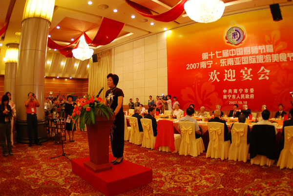 在这金秋十月的夜晚,在充满歌声与欢乐的南宁,我们大家欢聚一堂,共迎中国餐饮行业一年一度的盛事——第十七届中国厨师节的到来。首先,我代表中国厨师节组织委员会和中国烹饪协会,对南宁市委、市政府和南宁市各界人士为本届厨师节成功举行而做的精心准备和为此付出的辛勤劳动表示衷心的感谢!向为本届厨师节提供了支持和帮助的各有关单位表示诚挚的感谢!向在百忙之中前来参加本届厨师节活动的各级领导、嘉宾表示热烈的欢迎!向来自全国各省市自治区的代表团和港澳台地区的餐饮业同仁,以及来自世界各地的餐饮业同行致以亲切的问候!