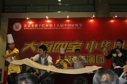 “中华厨艺绝技表演团”的成员,几乎都是来自全国各地的厨师,目前该团的70余个表演项目,均是在中华厨艺绝活演示暨鉴定大会上获最高记录奖、最佳厨艺奖的项目。此次为助兴第十八届厨师节,表演者都做了精心的准备。据表演团的组织者介绍,在本届厨师节期间,表演团将每天上下午各安排一场表演,届时观众们还将见到如长达