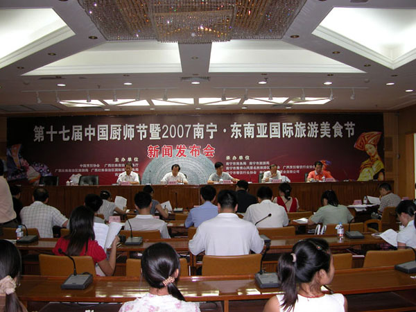 7月9日下午,南宁市召开“第十七届中国厨师节暨2007南宁·东南亚国际旅游美食节新闻发布会”,出席新闻发布会的区市领导有:自治区商务厅副巡视员刘经伦;广西国际博览事务局副局长、副市长郑军健;副市长黄焕升;第十七届中国厨师节暨2007南宁·东南亚国际旅游美食节组委会副主任、市商务局局长唐志喜。参加新闻发布会的还有第十七届中国厨师节暨2007南宁·东南亚国际旅游美食节组委会的各成员单位领导、市直相关部门领导和应邀前来采访的中央驻邕、自治区、南宁市有关新闻媒体。