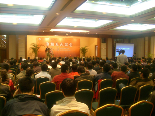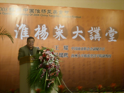 4月19日下午,2008扬州•中国淮扬菜美食节的活动之一“淮扬菜大讲堂”在扬州西园大酒店开讲。中国商业联合会副秘书长王耀博士和扬州大学旅游烹饪学院马健鹰副教授分别就中餐企业的发展和淮扬菜系的品牌经营进行了精彩讲演。世界中国烹饪联合会会长张世尧、中国烹饪协会副会长孙应武、副市长王玉新出席了“淮扬菜大讲堂”。