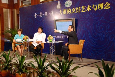 对话活动由中国烹协秘书长冯恩援主持,中国烹协常务副会长杨柳、清华大学工艺美院教授林华、北京新东方文化研究院院长徐小平出任了对话嘉宾。本次对话现场录像将由主办单位制成光盘出版发行。
