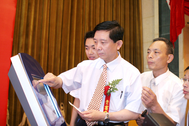 全聚德集团董事长姜俊贤兴致勃勃地为烤鸭查询触摸屏做开屏仪式
