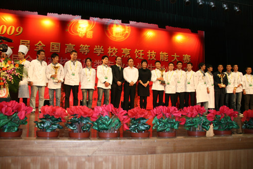 在颁奖典礼上,扬州大学旅游烹饪学院队、武汉商业服务学院队、无锡商业职业技术学院队、浙江商业职业技术学院队、陕西旅游烹饪职业学院队等5各代表队荣获了本届大赛的团体金奖,来自扬州大学旅游烹饪学院的留学生代表队荣获了本届大赛的特别奖。此外,盘丝饼、沙拉白菜、双龙相会等作品分别荣获了本届大赛的面点、冷菜和热菜项目的单项金奖。