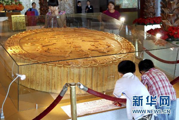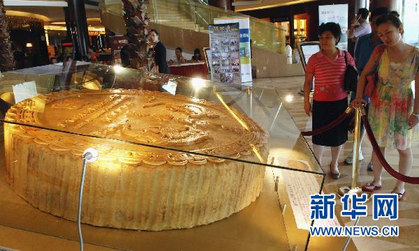 8月7日,南宁市民在中秋月饼现场品购会上观看展出的“月饼王”。当日,在广西南宁举行的2010中秋月饼现场品购会上,一块直径1.8米、重1000公斤的“月饼王”吸引了众多市民的目光。据悉,这块月饼是南宁市一家大酒店的6名厨师历经30天纯手工打造的。