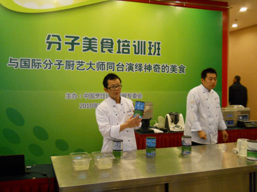 2010年11月29日-30日,中国烹饪协会西餐专业委员会携手新加坡著名西餐分子美食大师Jeffery Siew(萧坤宝),在北京美丽如画的神农庄园拉开了分子美食特训班的帷幕。来自全国11省13个市的20余家餐饮企业的31位学员,与国际分子厨艺大师同台演绎了神奇的分子美食。不仅零距离接触国际大师,更充分了解到了太平洋地区及东南亚、澳洲、旧金山和日本菜肴的奥秘。