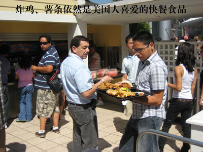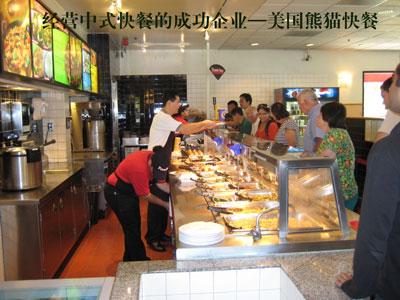 热狗、汉堡、炸鸡、薯条是美国人喜爱的食物,即便引起体重的增加他们也热情不减。在游览区、高速路服务区、工作午餐时,在大量的快餐食品店内,他们对进食大量的高热油炸食物义无反顾,不论大人小孩还是白领阶层都接受这种饮食文化。我们也了解了“汉堡王”等在美国本土成长起来的快餐企业经营情况,美式快餐快捷方便、产品标准、环境卫生,在餐厅设计上重视色彩灯光风格上的变化,将餐厅临窗的位置留给顾客用餐,将加工环节放在消费者可以看到的位置,这些措施加强了餐厅与消费群体的交流,餐厅人性化设计值得我们借鉴。中式熊猫快餐以美式快餐为设计理念经营中式菜品,很受欢迎。也有美国人专门经营改版中餐,如一家PF·陈的中餐品牌店在美十年间发展至400多家直营店。他们在餐厅设计上使用酒吧的低调昏暗光线,经营形式上将餐厅与酒吧业务结合。不使用华裔厨师和服务生, 用穿着暴露的“靓女”做服务生,用墨西哥和美国人做厨师,出售的菜品是新派中国菜并在菜名上西化,如长城蛋糕、上海马爹利、加甜